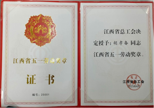 2025年5月16日,江西省總工會(huì)授予胡孝備“江西省五一勞動(dòng)獎(jiǎng)?wù)隆?/span>。